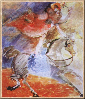 Однако сегодня Фонвизин более известен как непревзойденный виртуоз акварельной живописи. К 1930-м гг. он окончательно избрал для себя основную и излюбленную с тех пор акварельную технику, выявил романтически-приподнятый строй своего искусства, очертил круг тем, связанных с праздничными образами театра и цирка и с погруженными в радужную дымку детскими воспоминаниями. Сразу цветом, без карандашной подготовки, он пишет с натуры воздушно-легкие цветочные натюрморты, тающие в тумане пейзажи, но главным образом портреты, отдавая предпочтение женским моделям. Любимые его героини - актрисы, часто в театральных костюмах, связанных с определенной ролью, погруженные в приподнятую эмоциональную атмосферу сцены ("Портрет Д. В. Зеркаловой", "Портрет Ю. С. Глизер", оба 1940, и др.). А детская любовь к цирку диктовала ему бесчисленные, уже не натурой, а фантазией порожденные цветовые наброски нарядных наездниц (серия "Цирк", 1940-70-е). Романтической дымкой овеяны тающие в цветовом мареве образы популярных романсов (серия "Песни и романсы", 1940-60-е), детские воспоминания о провинциальном быте ("Извозчики", 1940-е). Сюда же примыкают и лучшие его работы для книги. Между тем ни импровизационная, как бы небрежная свобода акварельного письма, ни романтическая мечтательность его образов не отвечали в 1930-х и 1940-х гг. официальным художественным установкам, и потому творчество Фонвизина подвергалось в ту пору нападкам в печати. А в годы войны он был на некоторое время выслан в Казахстан за немецкое происхождение. И все же художник оставался неизменно верен характеру своего дарования, до конца жизни разрабатывал и варьировал все те же любимые мотивы.